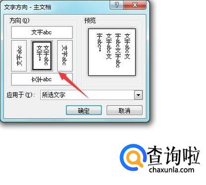 点击文字方向选项在弹出的对话框内设置文字方向为竖排,如图所示: