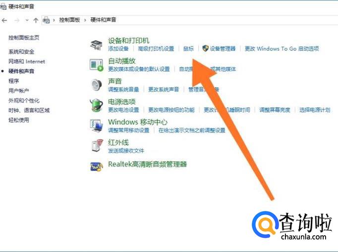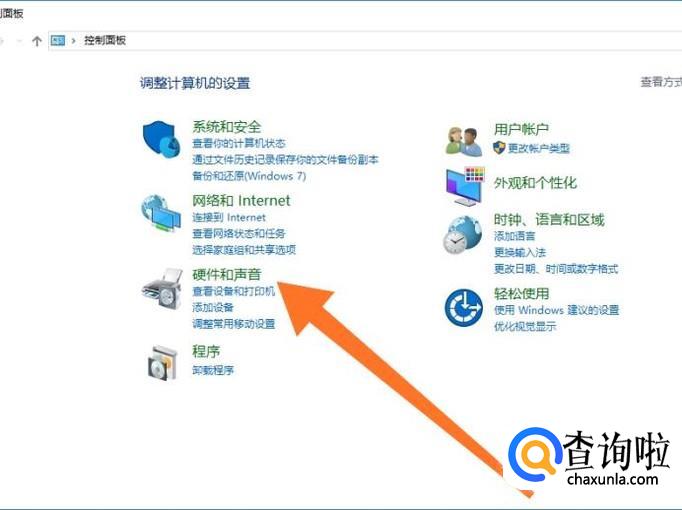 进入控制面板后,点击进入“硬件和声音”设置选项。