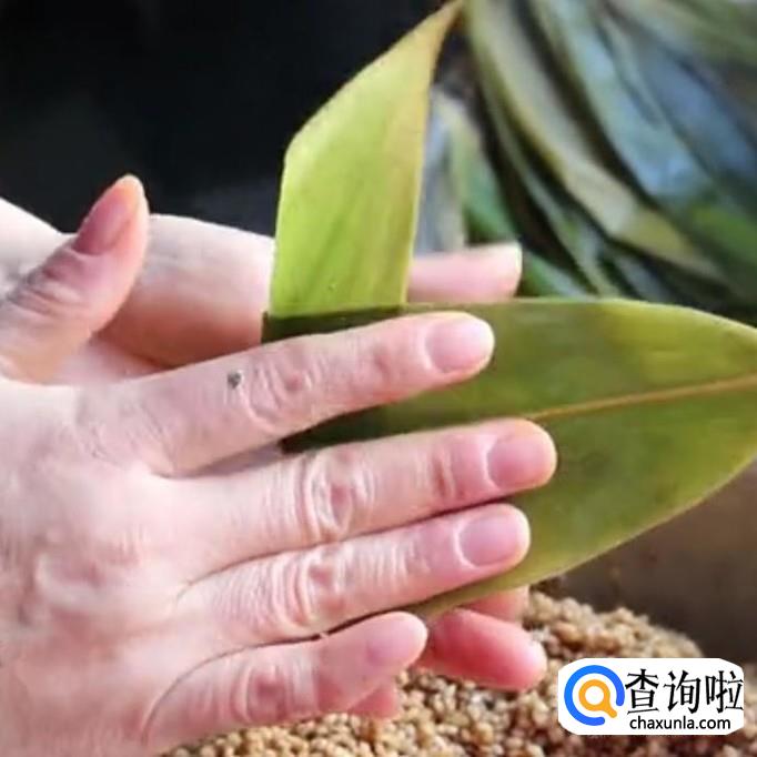 首先我们选择一片比较大的竹叶,按照如下图所示的方式卷一个圆锥形的角