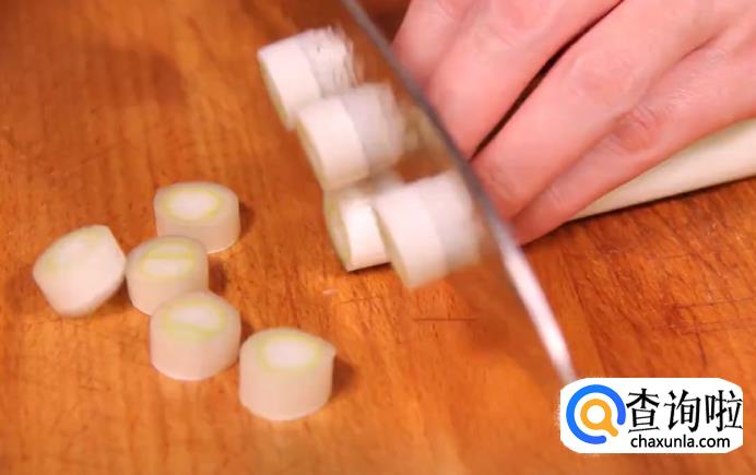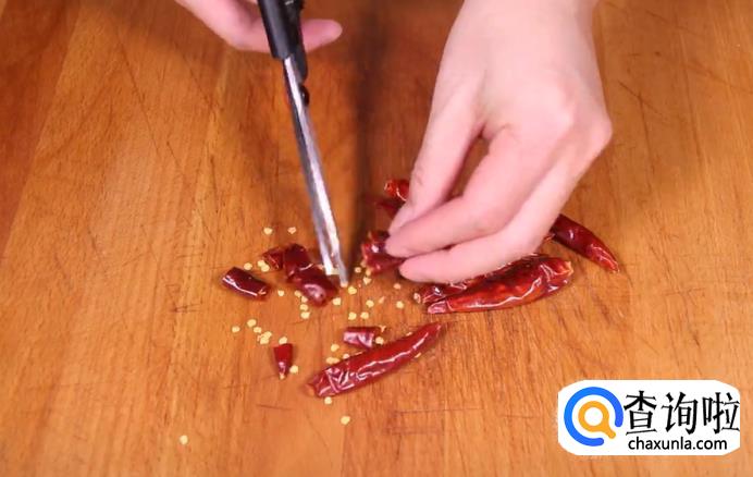 接着,将大葱切成小段,生姜切成末,大蒜剥好皮,再把干辣椒剪成小段,放在一旁待用。