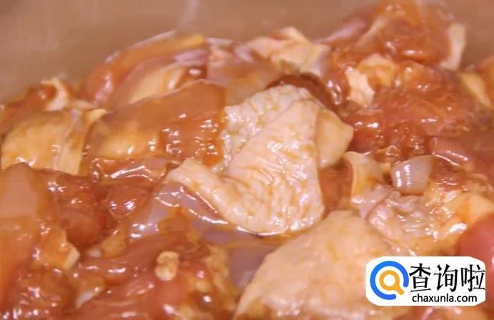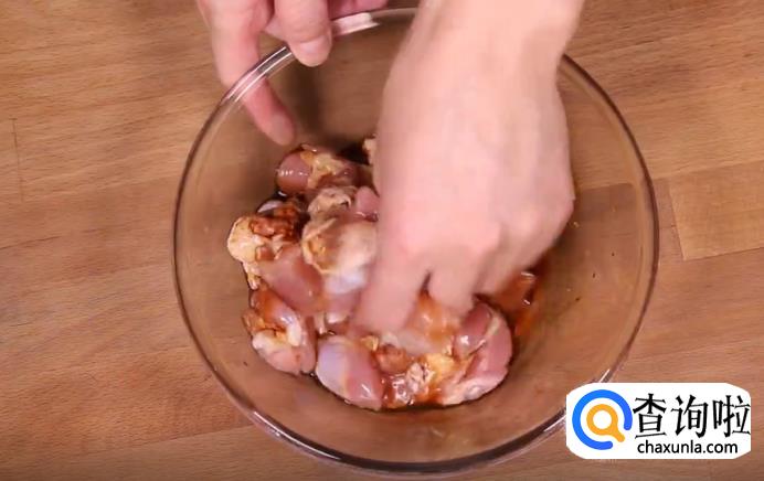 首先,将鸡腿肉去骨切块,装在碗里,再加入料酒、老抽和盐,一起抓匀。接着加入淀粉,抓匀后再加油,搅拌均匀后腌制10分钟。