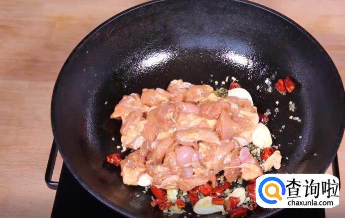 热锅起油,将姜末、大蒜瓣、花椒和干辣椒段放入锅内爆香,然后再把鸡腿肉放进去,一起翻炒。