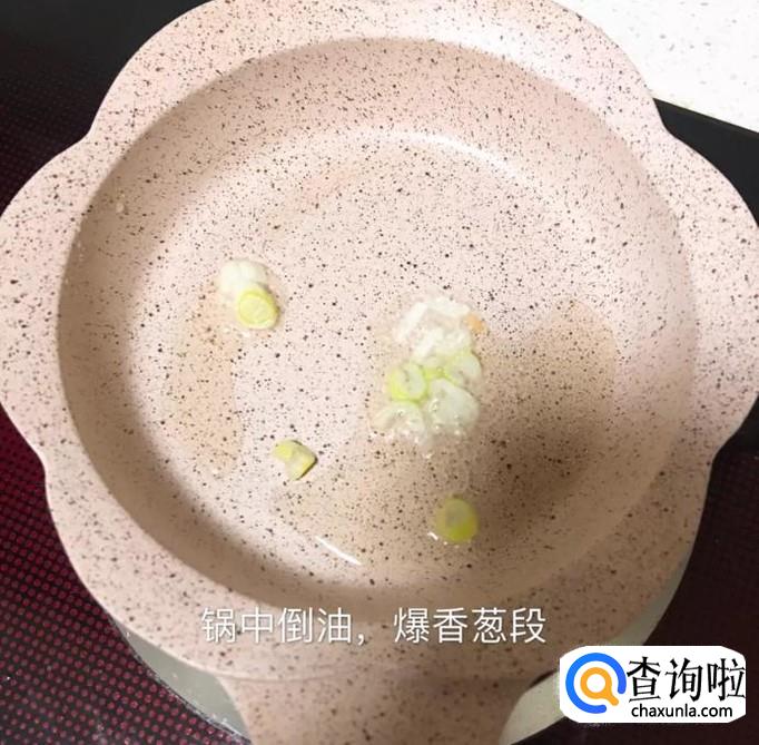 然后锅中放入适量的食用油,待油冒烟,倒入葱段爆香,如下图所示。
