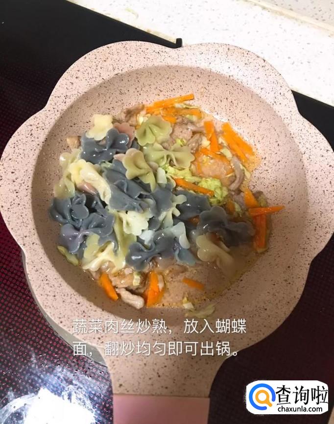 接着把蝴蝶面倒入锅中翻炒均匀就可以出锅了。