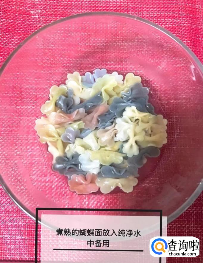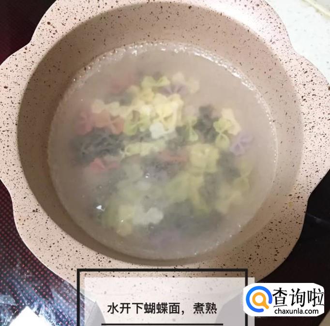 然后锅中放入适量的清水,待水烧开,倒入蝴蝶面煮熟,如下图所示。