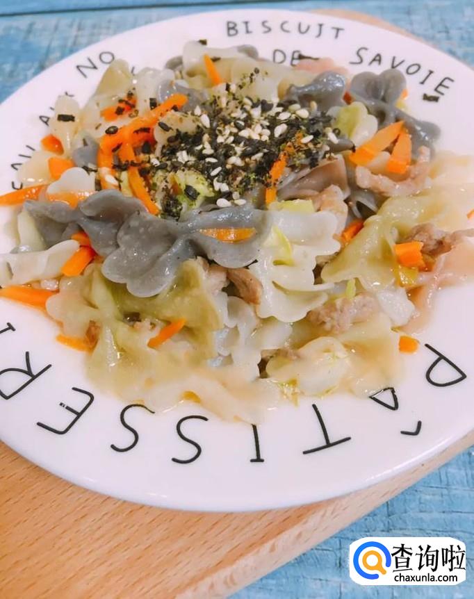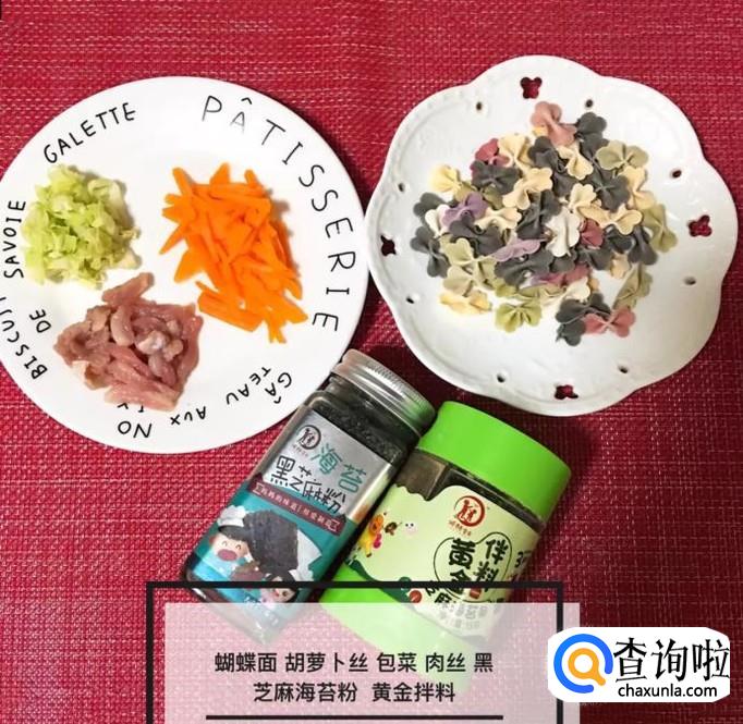 首先准备好所有的食材,如下图所示。小贴士:蝴蝶面十克,胡萝卜丝适量,包菜适量,肉丝适量,黑芝麻,海苔粉适量,黄金拌料适量。