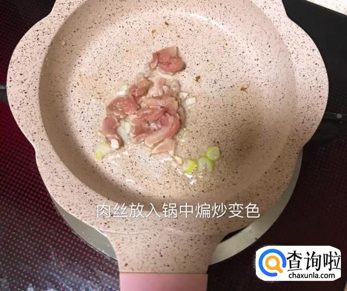 接着把肉丝放入锅中煸炒至变色,如下图所示。