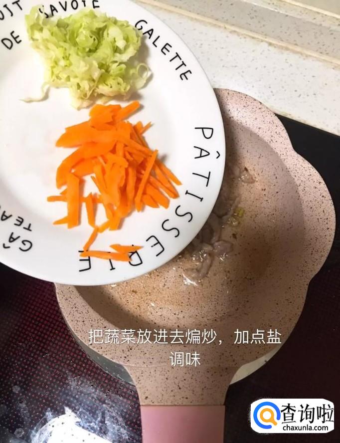 然后把胡萝卜丝和包菜倒入锅中煸炒两分钟并加入适量的盐调味,如下图所示。