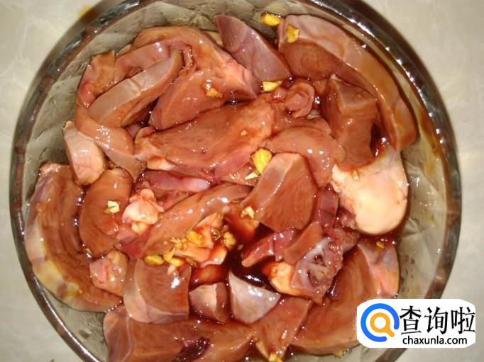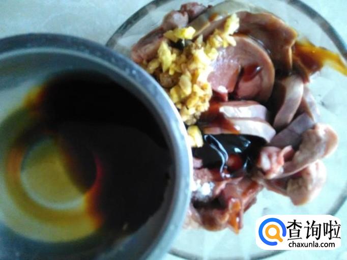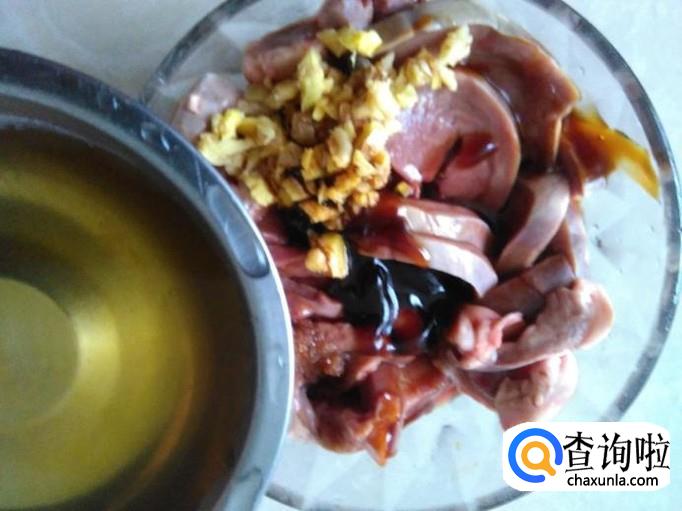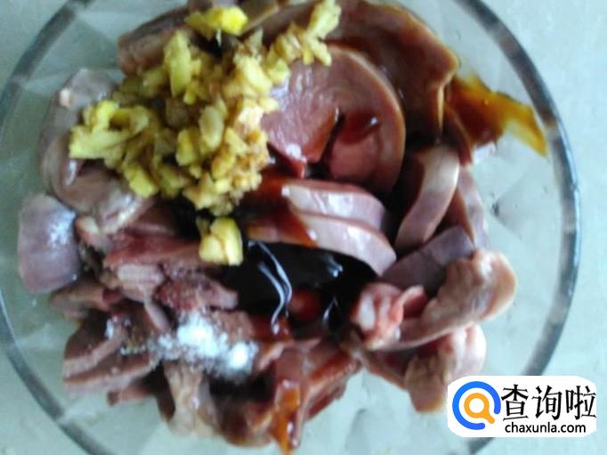 猪心切成小片,加适量的盐、姜蓉、耗油。
