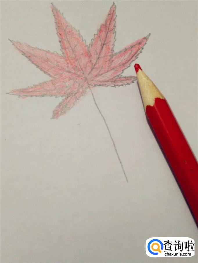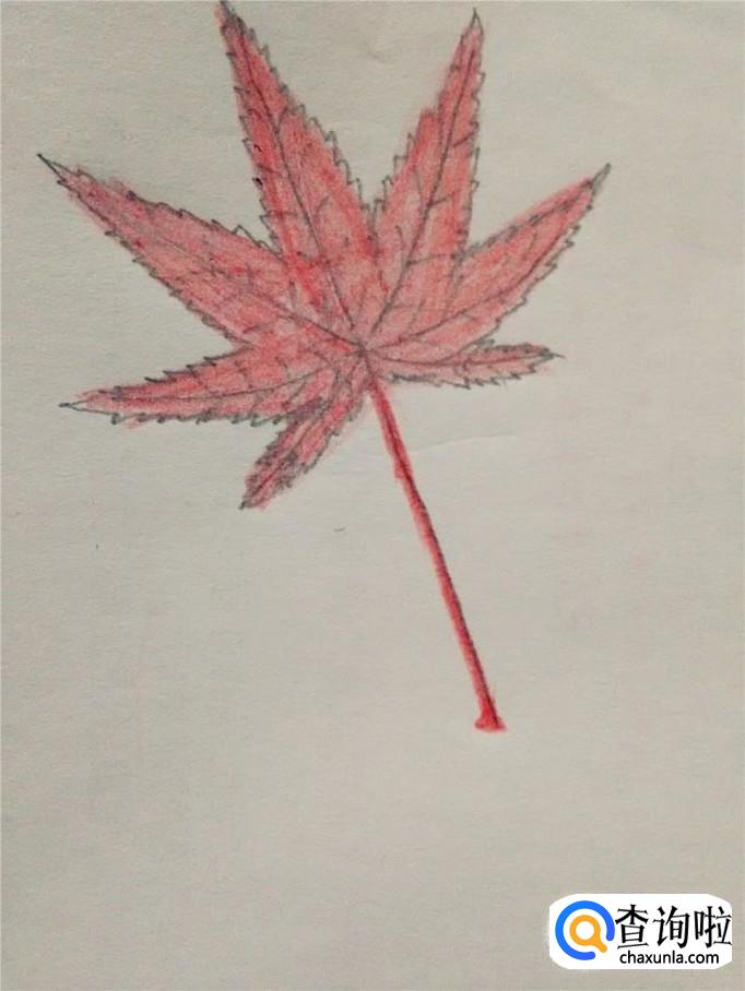 再用红笔把叶柄也涂成红色,并在叶柄的根部画一条小小的横道,表示叶柄和树枝连接的地方,一片红色的枫叶就画完了。