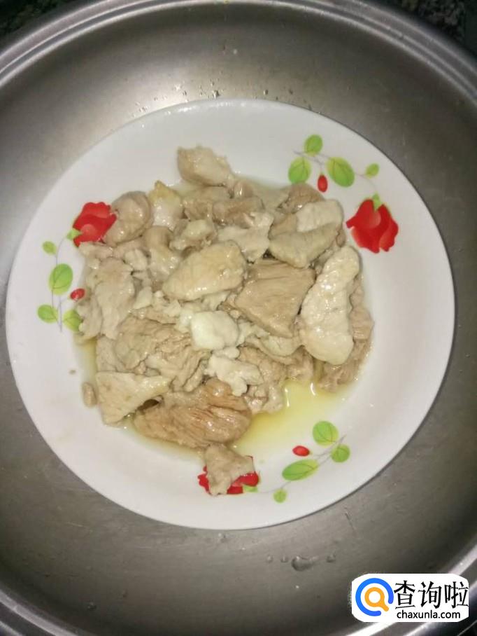 取一块瘦肉,将瘦肉洗净,切成小块薄片,放入碟子里,加少量料酒、蚝油抓匀,腌制十五分钟,再加少量生粉和食用油,抓匀;