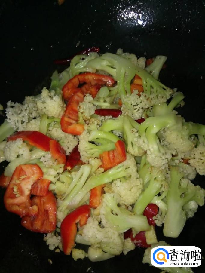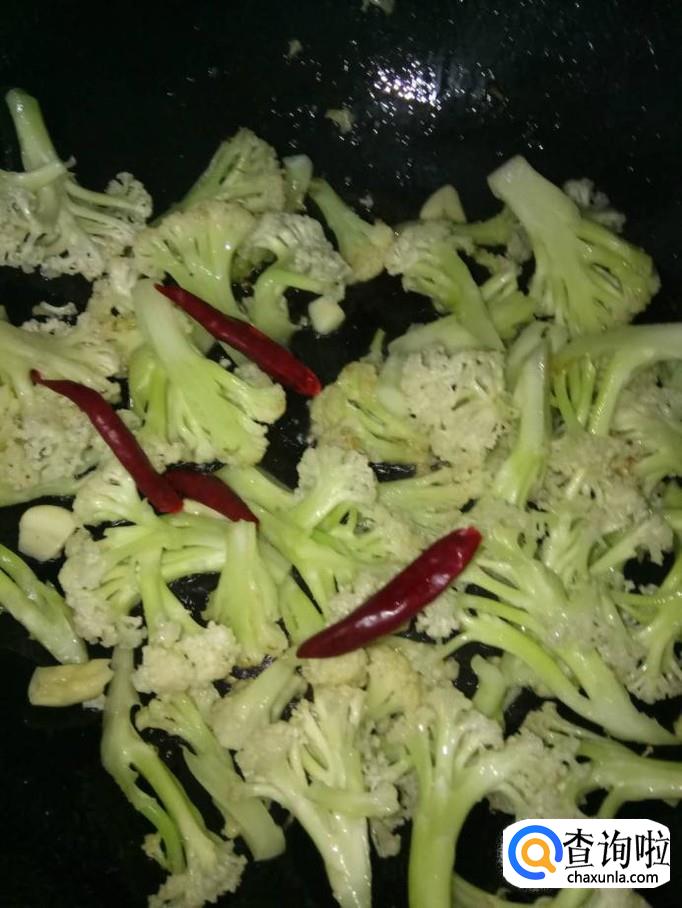 再开火,加入适量食用油,待油温升高,将花菜下入锅里,翻炒几下,加入几个干红辣椒一起翻炒;不喜欢吃辣的可以不放;