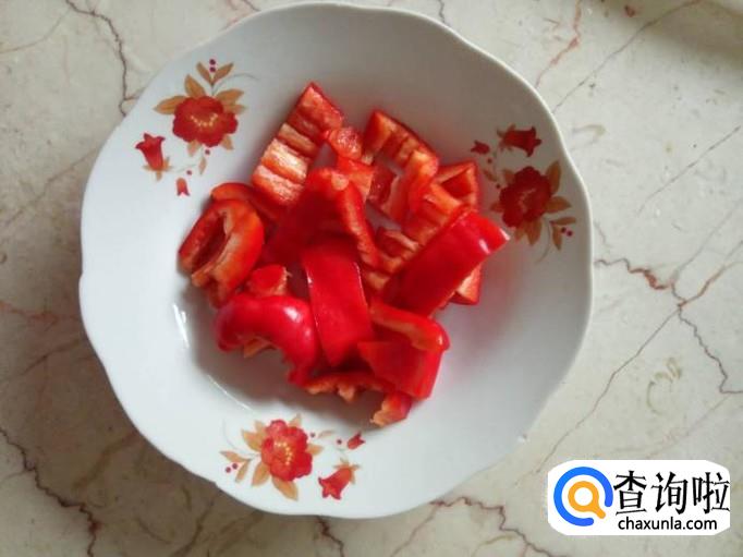 取1-2个红椒,将红椒去籽去蒂,洗净,然后切成1cm左右的小块(片);红椒除了一个点缀的作用,也能够使整道菜口感更好;