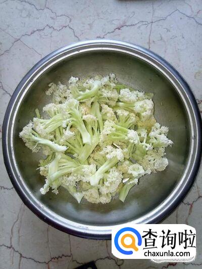 取适量花菜,用刀先将花菜切成一小朵一小朵,再用清水泡洗干净,控干水分;有些花菜还需要注意是否有虫子,如果有,一定要处理干净;