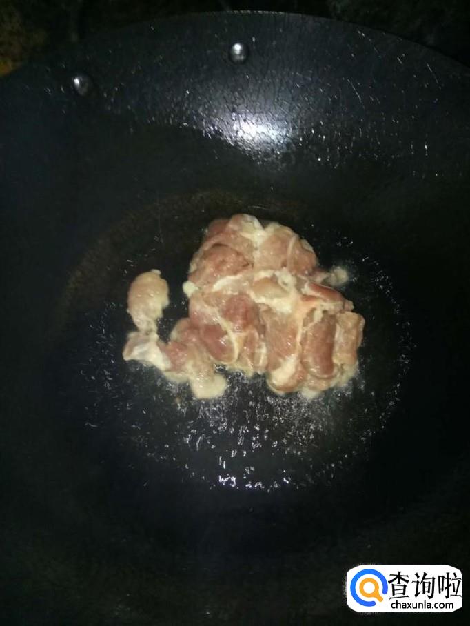开火,加入适量的食用油,待油温升高后,将瘦肉下入锅里,煎至肉色变白后,盛出备用;