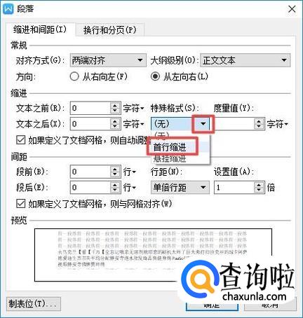 弹出的界面,我们点击特殊格式边上的下拉箭头,弹出的界面,我们点击首行缩进;