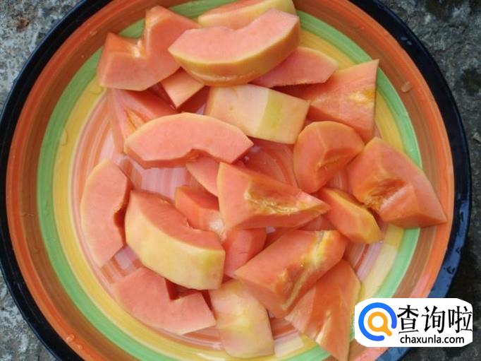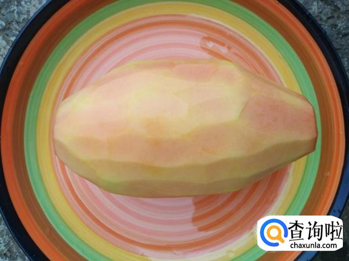 将木瓜里面的籽,刮掉,洗净,切成小块,待用。