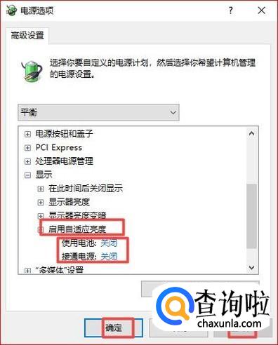 弹出的界面,我们点开显示,然后我们可以看到启用自适应亮度,我们将里面的设置全部都设置成关闭,之后我们点击应用,然后我们点击确定,这样我们就解决这个问题了。