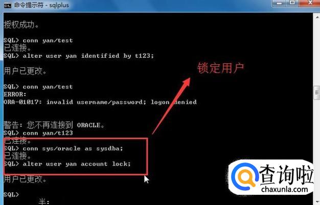 如果不想让一个用户进行数据库操作,你可以把这个用户锁定,如下图所示,通过alter和lock配合使用即可实现