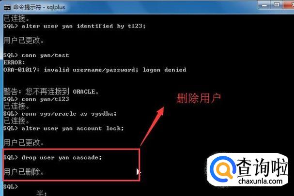 最后演示一下如何删除一个用户,如下图所示,删除用户运用drop命令即可