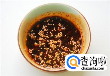 碗里倒入两小勺生抽,海鲜酱油也可以,一勺子蚝油,一勺子白糖和适当食盐,加上一勺子香醋,半小勺香油,然后两大勺辣椒油,再撒一点芝麻搅拌成汁。