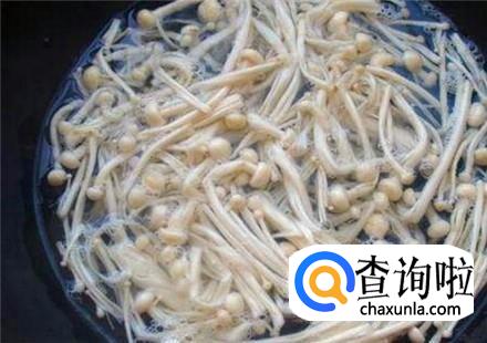 锅里烧开水,把金针菇投放进去,用筷子不断翻几下,让金针菇均匀受热,直到金针菇变软为止,快速捞出控干水分。