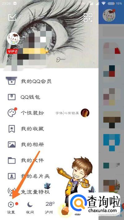 打开手机QQ并登录,点击左上角的头像,然后点击设置,如图所示。