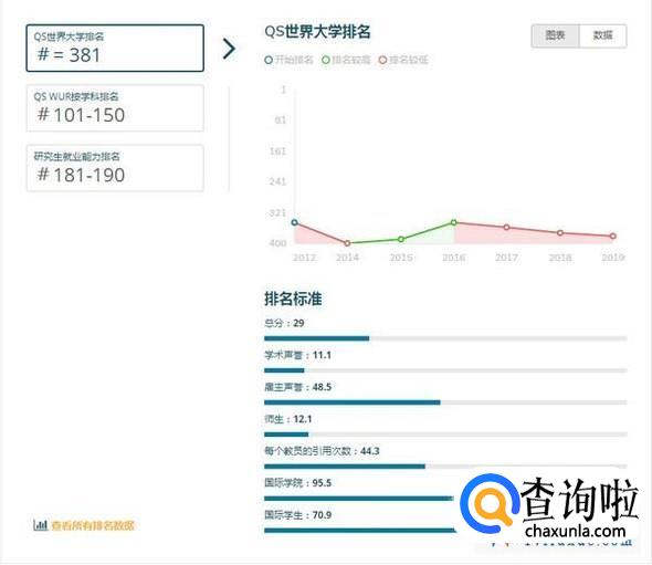 注:QS世界大学排名是世界公认最具影响力的全球性大学排名之一,主要评价指标为:学术领域的同行评价(40%)、全球雇主评价(10%)、单位教职的论文引用数(20%)、教师/学生比例(20%)、国际学生比例(5%)、国际教师比例(5%)