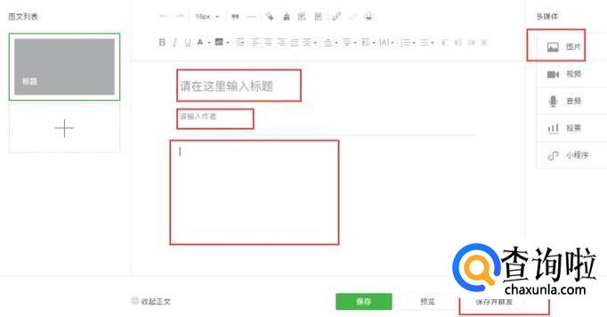 然后输入文章的标题、正文、图片,然后点击“保存并群发”,这样就可以发送图文推送了。