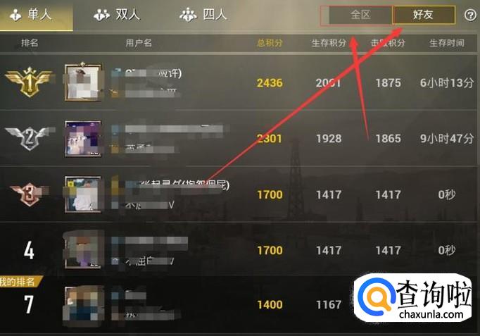 进入之后的画面是现实的好友的排行榜如下图,如果你想看全部区服的排行榜,点击全服,如下图