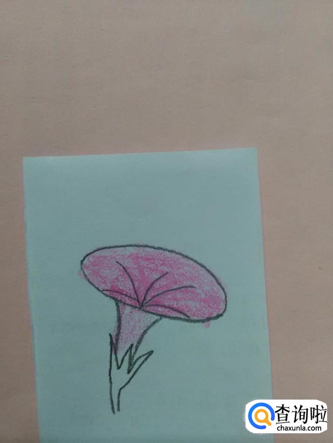 用油画棒画花朵,先画轮廓,画铺浅色,然后涂深色部分,最后涂花托,下面就开始画牵牛花。