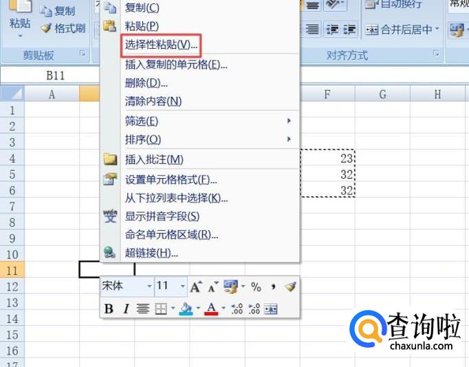 之后我们点击其他单元格,然后右击,弹出的界面,我们点击选择性粘贴;