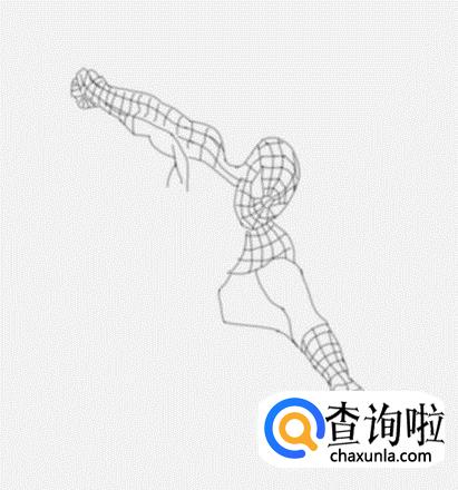 在两只胳膊的下面画出蜘蛛侠的身体,然后在身体上画出蜘蛛网格线,如图所示: