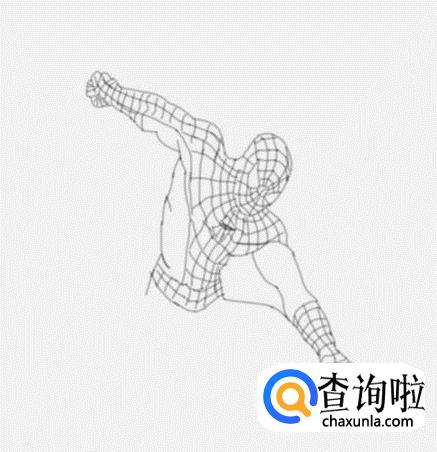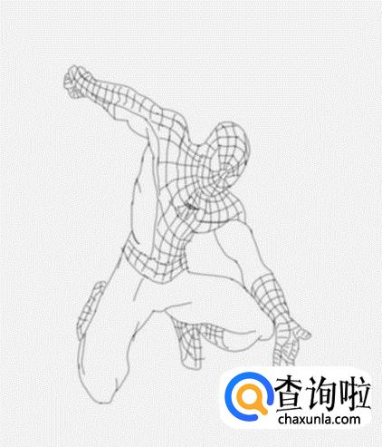 最后在身体下面画出蜘蛛侠的两条腿及脚部,然后在脚部上画出蜘蛛网格线,这样超凡蜘蛛侠就画好了,如图所示:
