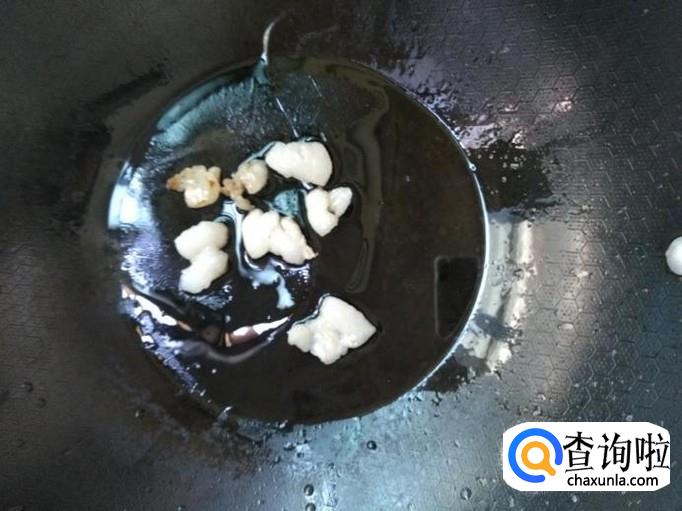 把锅烧热,调小火,放入猪白肉,用小火慢煎出油。
