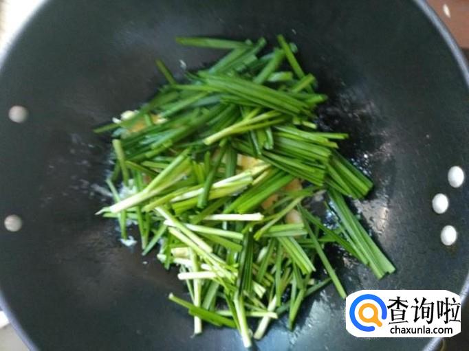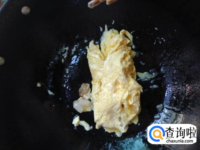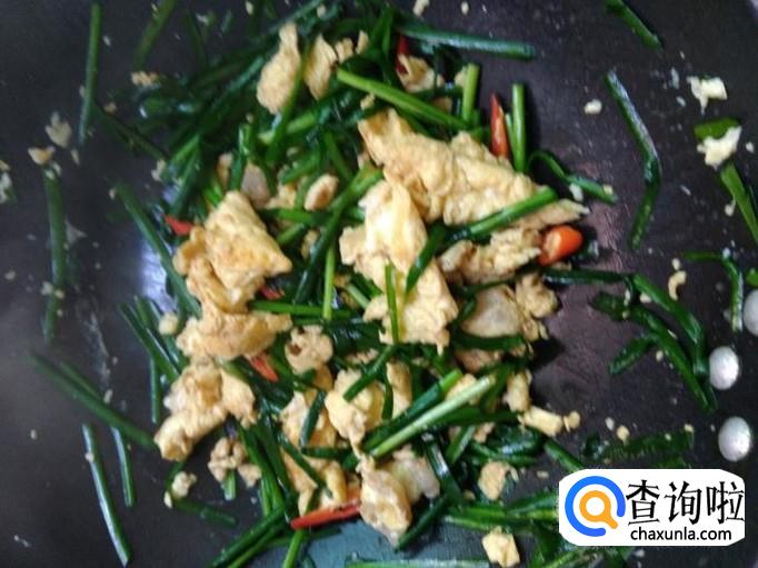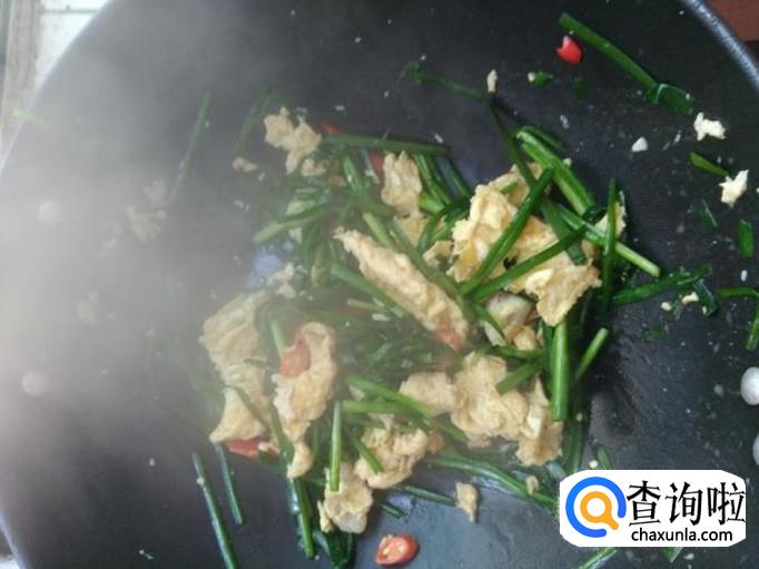 将鸡蛋弄成小块,倒入韭菜,调中火。(把鸡蛋弄成小块是为了更好的入味)