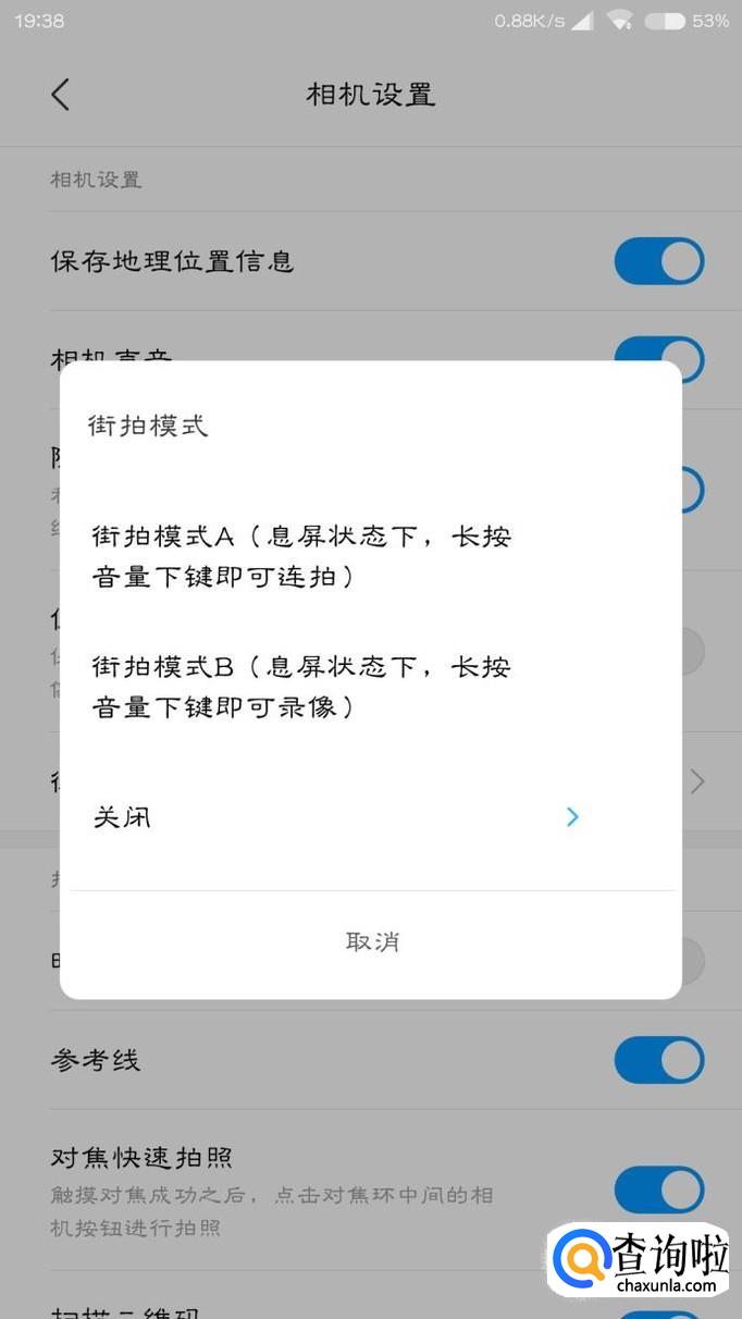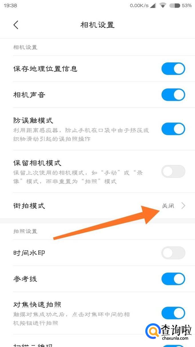 在设置里面向下拉一下,就能在设置里面找到“街拍模式”,点击一下。