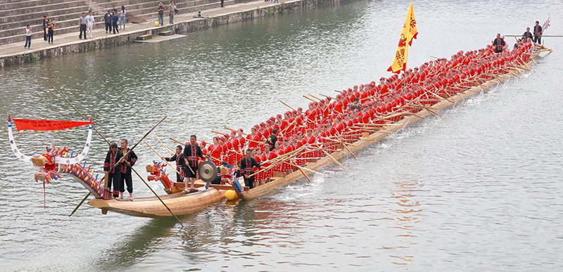 龙船节是苗族的一种水面划船比赛的传统节日,流行于贵州的台江、施秉两县交界处的清水江两岸,和注入这段河的台江巴拉河两岸,黔东苗语称为“哈仰勇”(qab niangx vongx)。在这里的平寨、廖洞等六七十个苗族村寨,每家都有一至两条划船比赛用的龙船。每年的农历五月五日,或二十四日至二十七日这五天,居住在河两岸的苗族群众轮流举行盛大而隆重的龙舟竞赛。在湖南湘西的凤凰、泸溪、吉首、保靖、花垣等地,也流行划龙船,而且分男队、女队、男女混合队比赛,场面非常热闹。苗族的龙船节,虽是以赛龙船为主要内容的节日,但同时也是民族文化娱乐和青年男女进行社交活动,中老年人探亲访友、交谈年景和生产经验的节日。