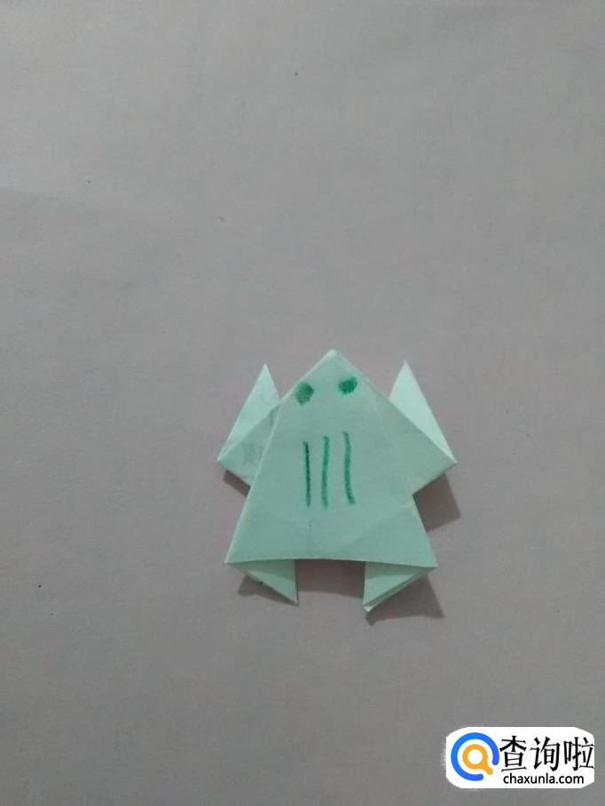 将纸反过来,用绿笔在上面画两个圆点,表示眼睛,在眼睛下面画三条竖线,表示背上的花纹,小青蛙就折好了。