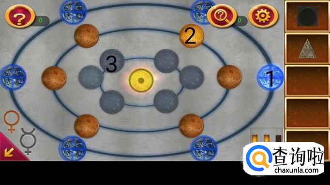 点击右边第一个机关,上面貌似一个宇宙。根据提示图纸,按图示三步点亮机关,获得圈图案。