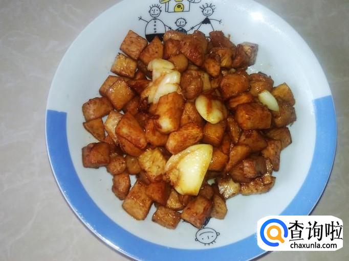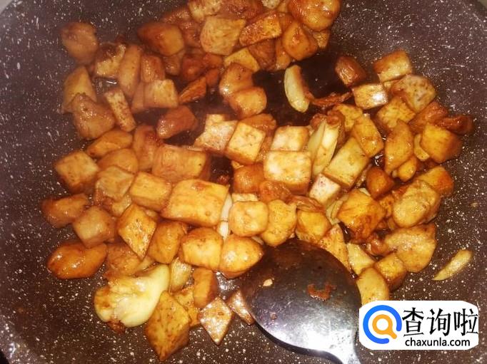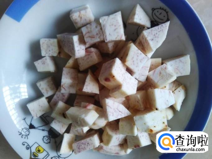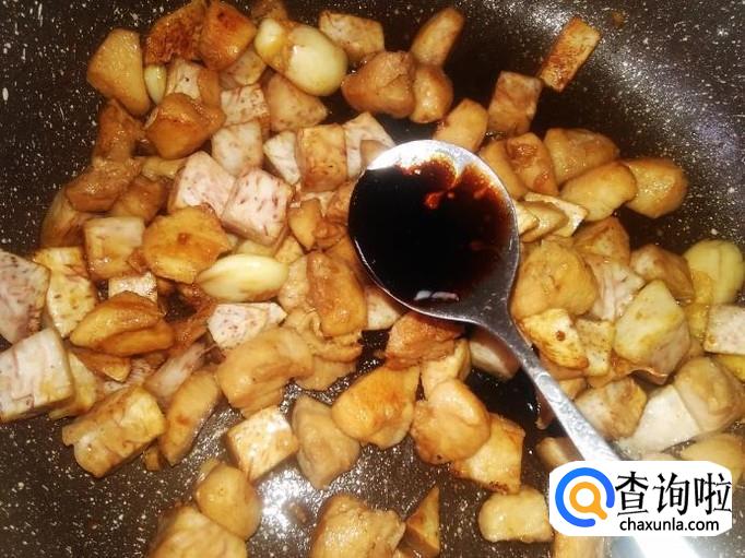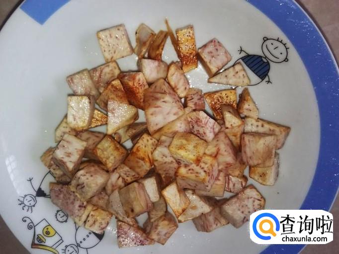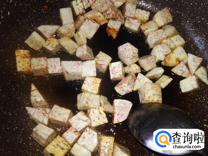 用中火炸到香芋丁变成金黄色,然后铲上碟子。