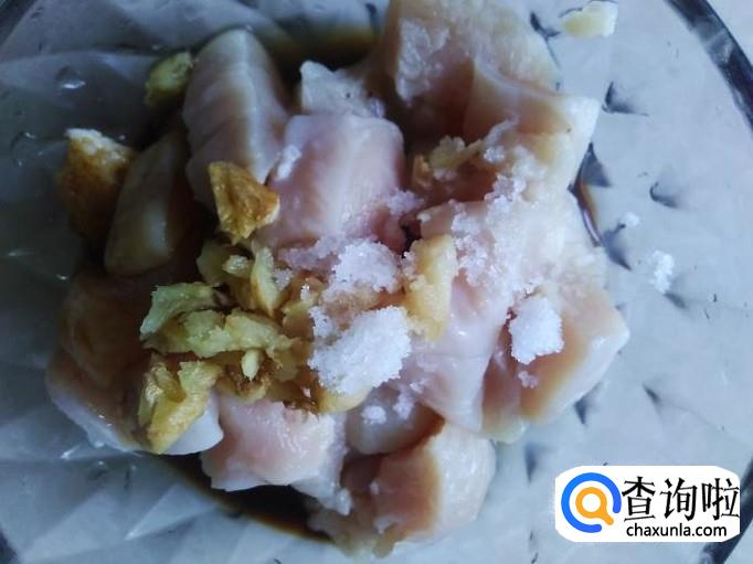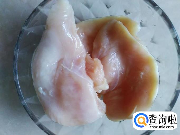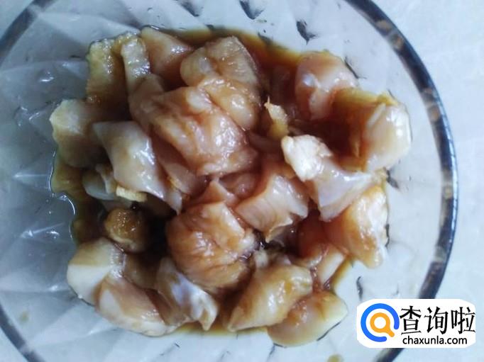 把鸡胸肉切成小丁,加适量的盐、姜蓉、生抽、料酒腌制几分钟。