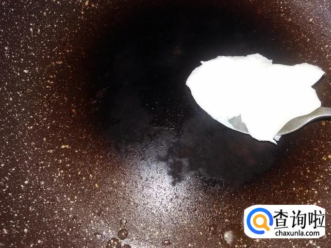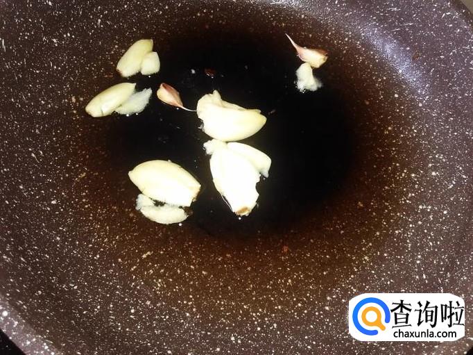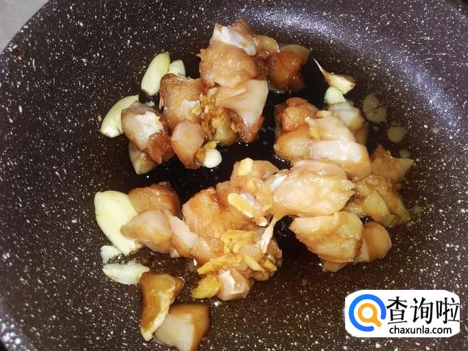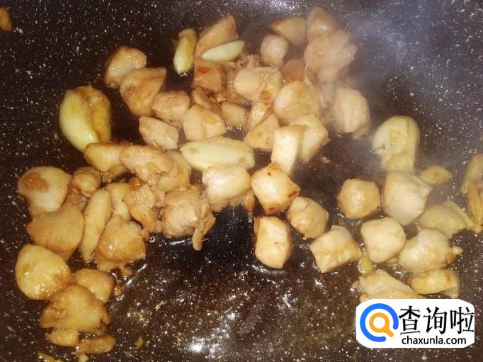 再开火下油,放蒜米进去爆香,然后放鸡丁进去。