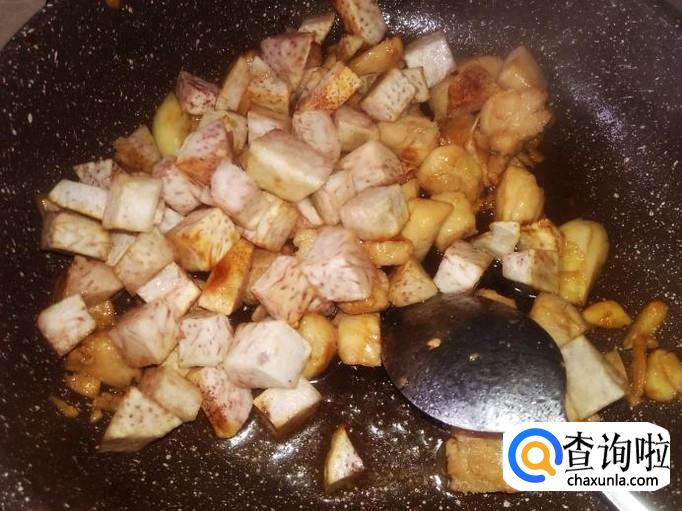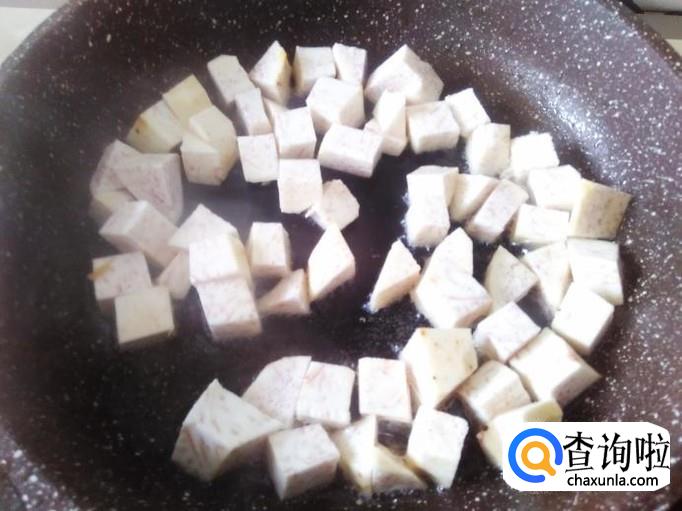 开火,放1勺猪油进去,等猪油融化完再放芋头丁进去,撒少量的盐花翻炒入味。
