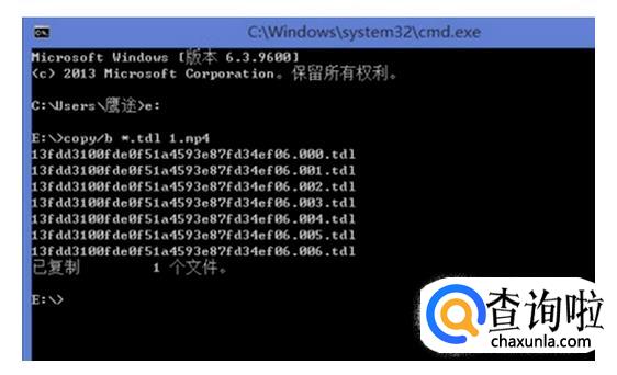 进入cmd之后,输入e: , 按下回车 ,然后在接着输入 copy/b *.tdl 1.mp4。 注意,b和*之间有1个空格、tdl和1之间,也有空格。也可以直接复制上面的内容,粘贴过去。可以对E盘下所有tdl格式的文件进行合并。