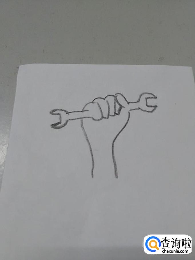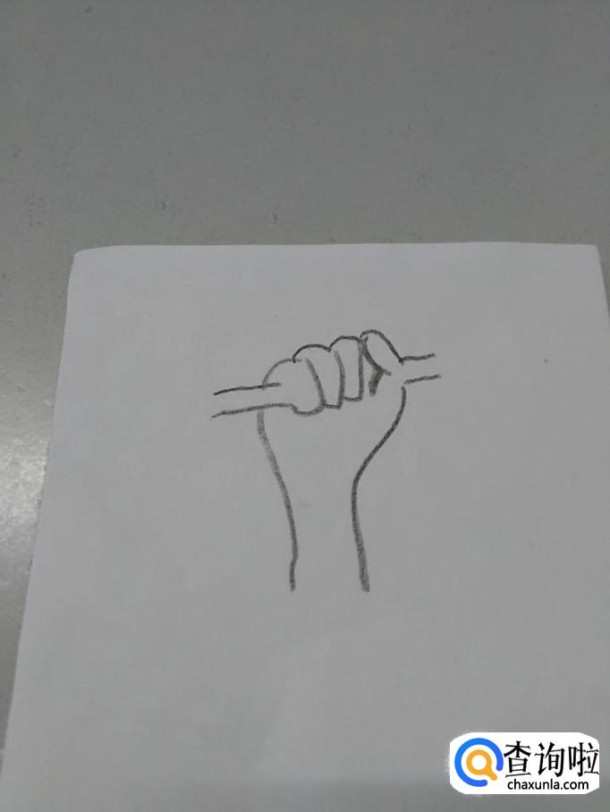 在拳头左右两端分别画两条平行的直线,表示搬手的杆。