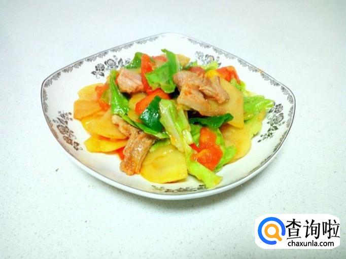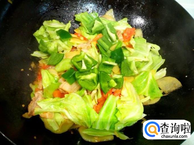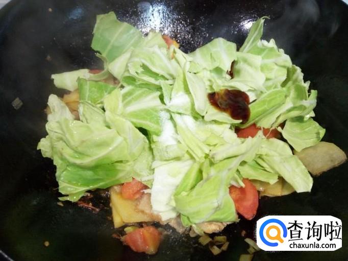 土豆片炒至五分熟,放入西红柿翻炒。炒至西红柿变软,放入卷心菜翻炒,放入少许蚝油,盐。