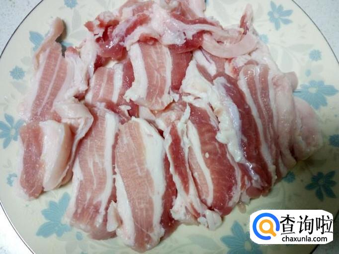 五花肉用水冲洗干净,控干水分,切成片。