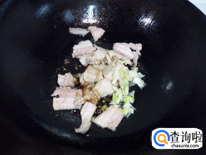 炒至肉片下油,颜色微白,放入料酒,少许酱油,葱,姜,翻炒。随即放入土豆片翻炒。