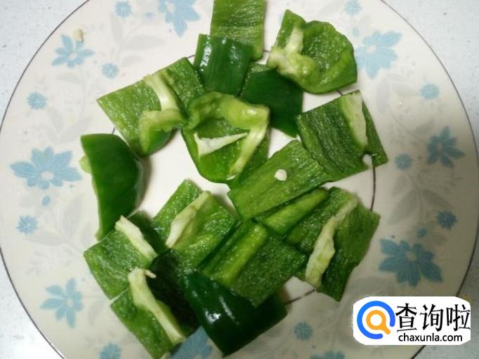 青椒用水清洗干净,控干水分,切成块。切好葱,姜,备用。